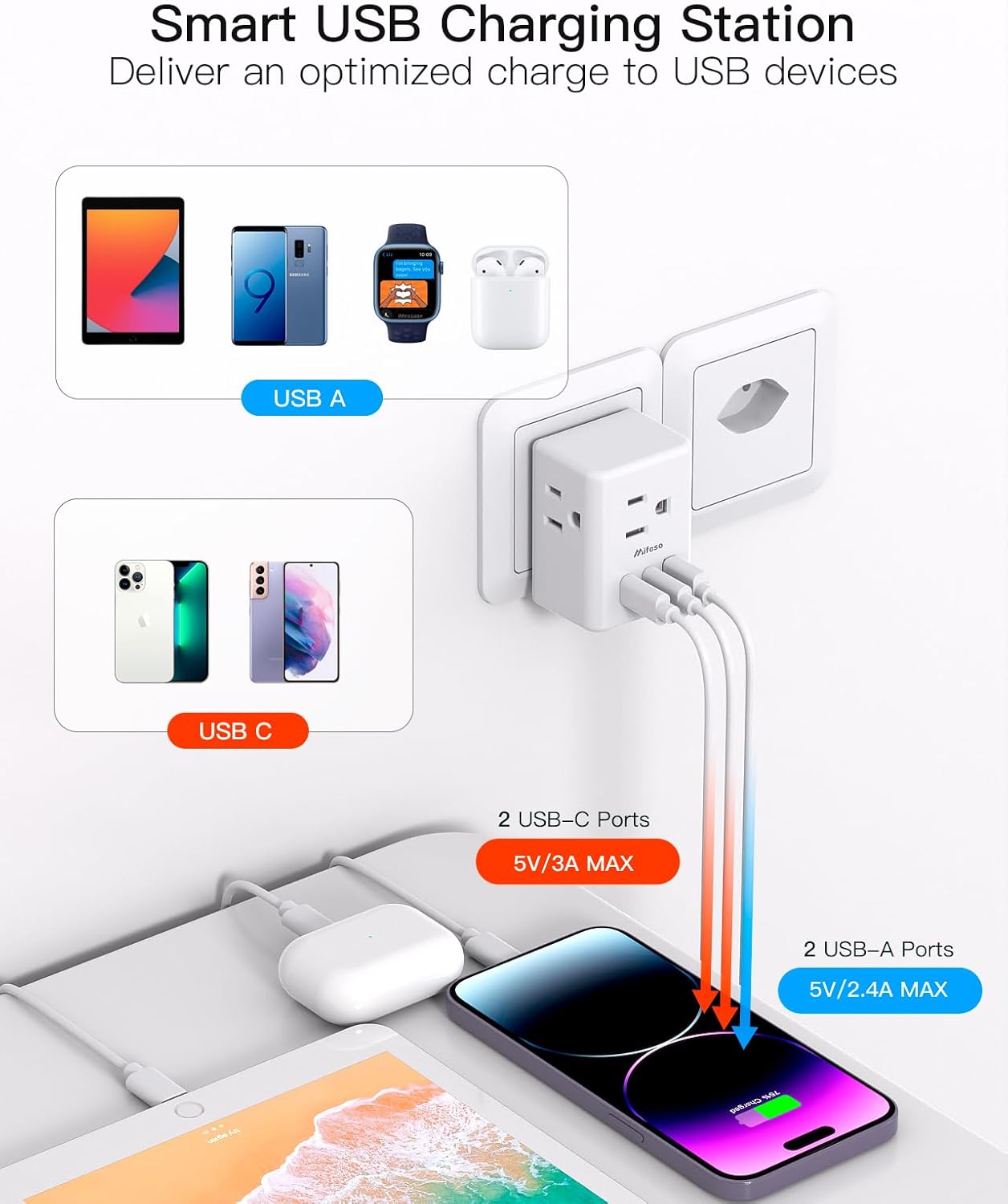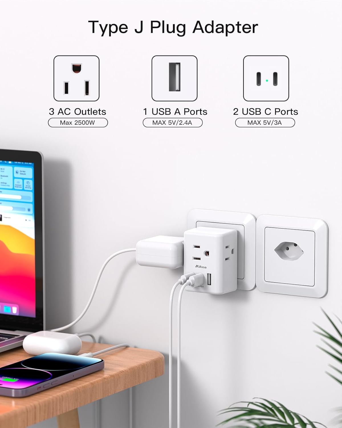 【6-in-1 Switzerland Journey Plug Adapter】- This Kind J plug adapter converts a single Kind J socket into 3 American shops and three USB ports (together with 2 USB-C). The three-sided design means that you can cost as much as 6 units concurrently with out blocking different shops. Excellent for charging units at airports, resorts, and dorm rooms.