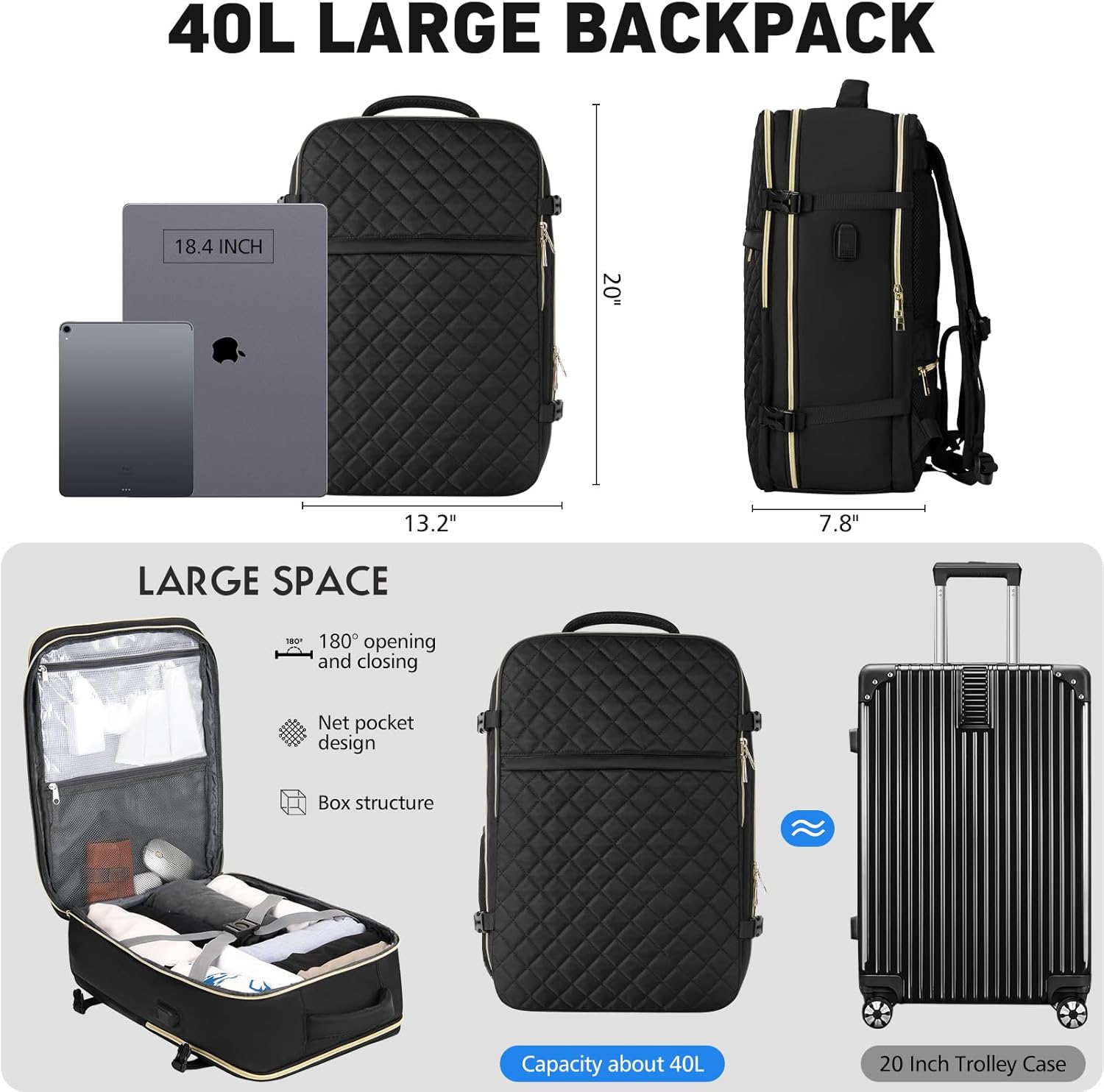 【Roomy Capability & Multi-Pockets Design】: Our backpack has a 40L Massive capability and includes a spacious capability with an affordable partition, together with a padded pocket book/pill compartment for 18.4″ laptop computer and 12.9” iPad; a important compartment storing quite a lot of issues together with 6-9 items of clothes, footwear, books, and plenty of different objects; a entrance compartment with many pockets to maintain your belongings organized.