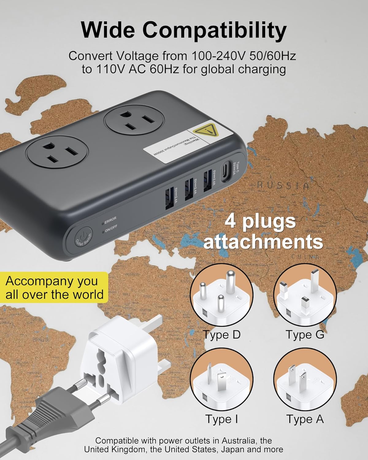Worldwide Use: Journey Voltage converter with 1 EU cable and 4 worldwide plug adapter (Kind A/G/I/D output), you may simply use American electronics in lots of international locations and areas world wide together with Europe, England, Italy, France, Germany, Spain, Eire, Australia, China, Japan, India, Thailand, Singapore, Mexico, Canada, Argentina, Brazil, Peru, Africa, Egypt, South Africa and extra.