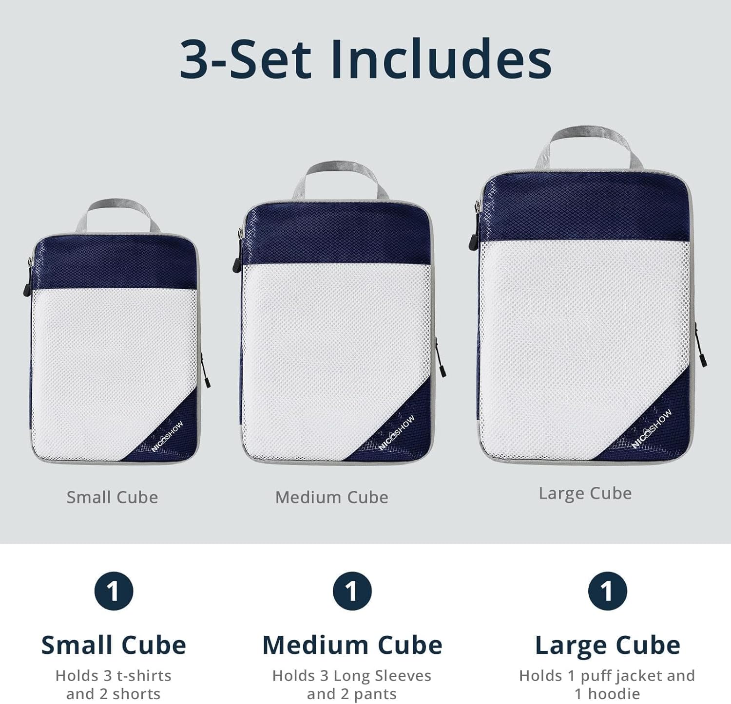 What Will You Get: NICOSHOW 3-set compression packing cubes for journey embrace 1 small dice (12”x8”x4”), 1 medium dice (14”x10”x4”), 1 giant dice (16”x12”x4”)