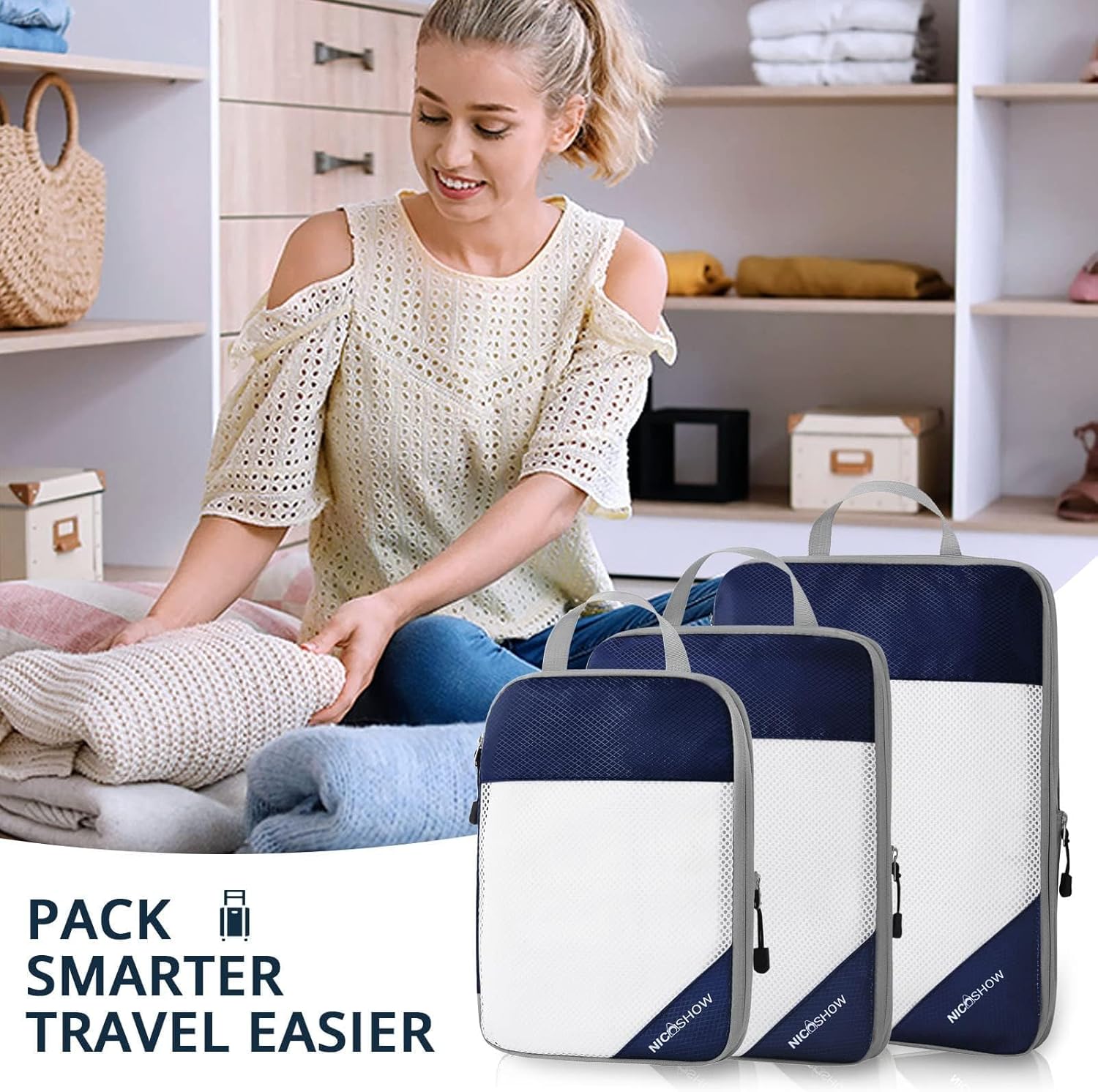 3 Set Compression Packing Cubes for Travel – Compressible, Lightweight, and Space-Saving Packing Cubes, Travel Essentials for Women, Navy