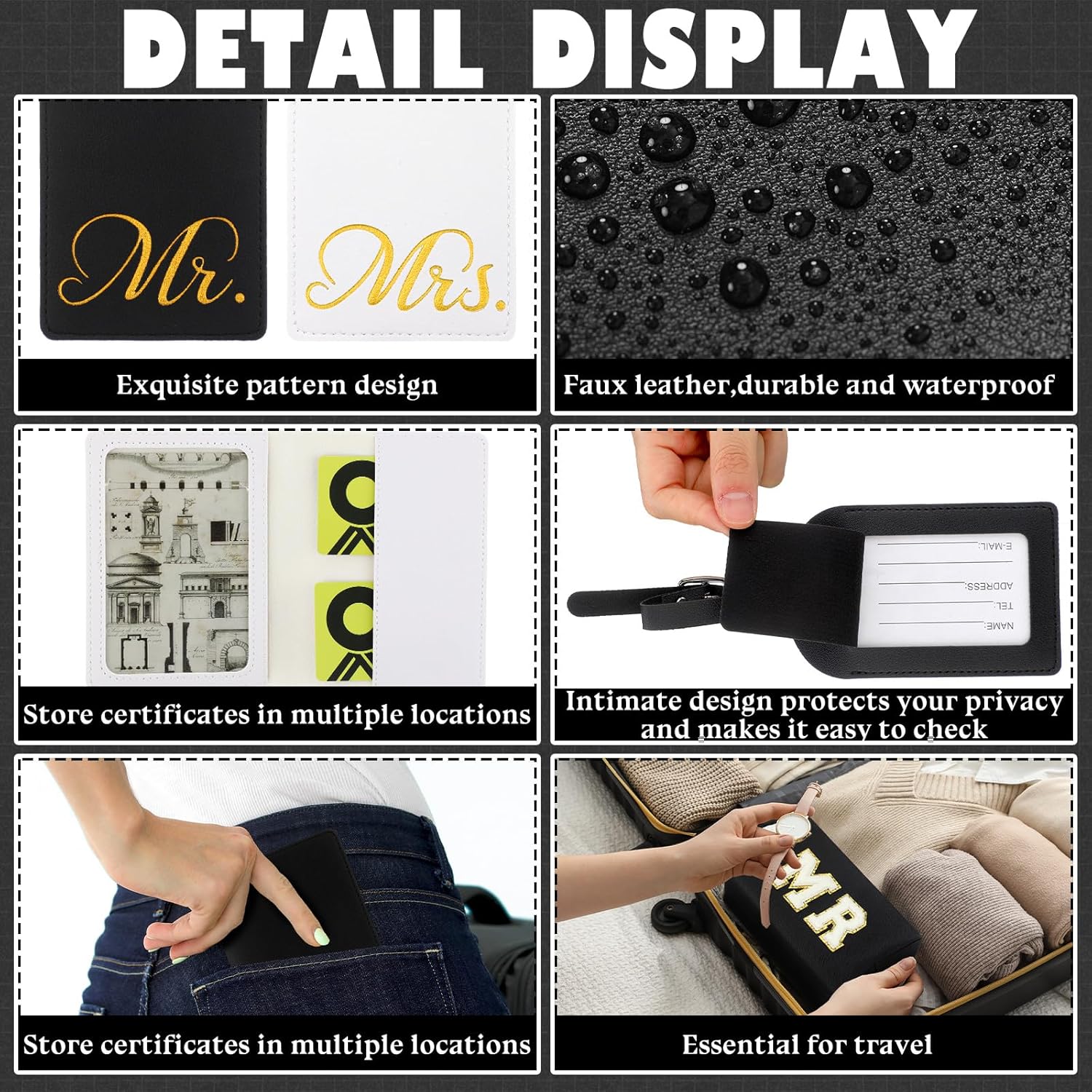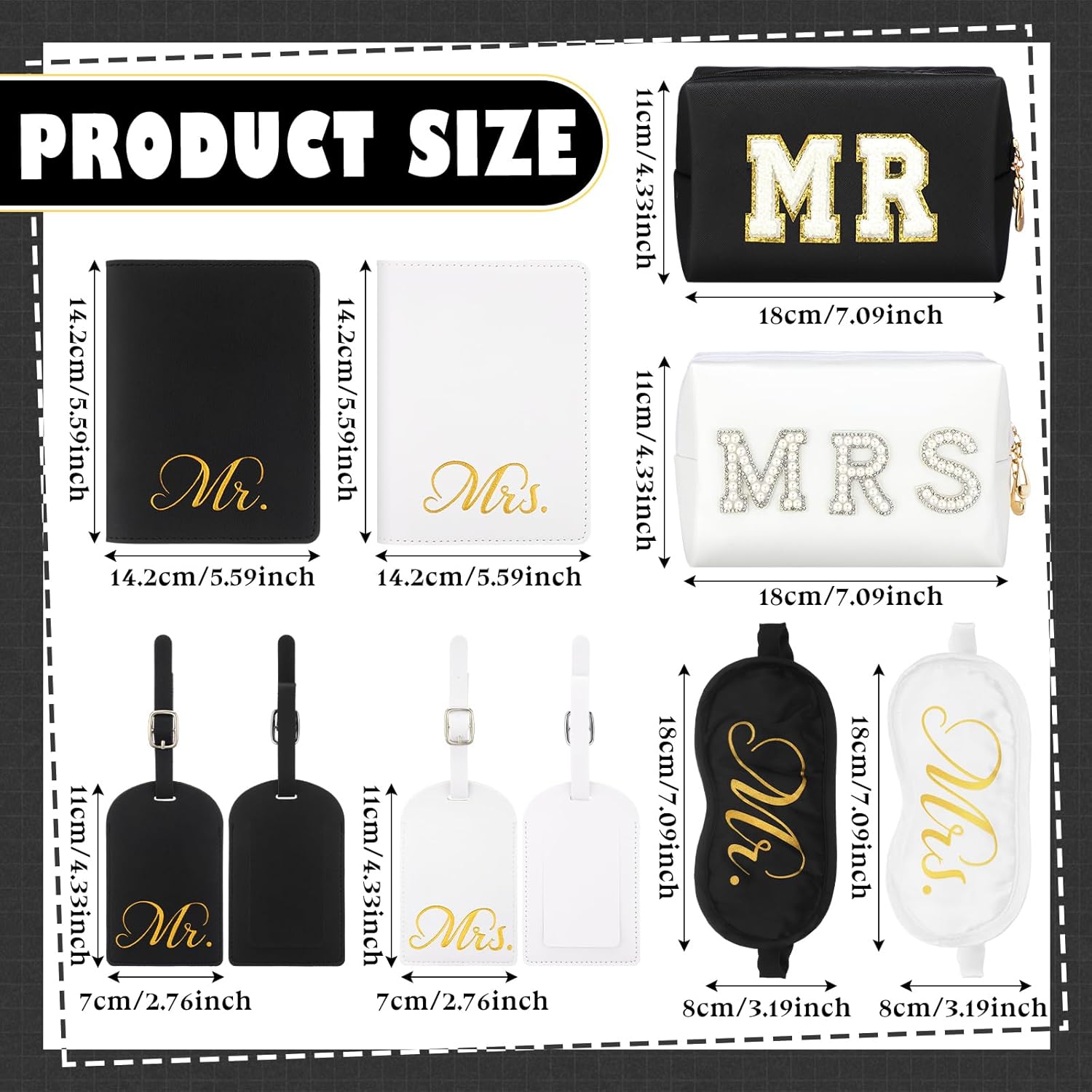 Our Mr. and Mrs. Baggage Tags and Passport Holder Set Consists of: 2 baggage tags passport holder, 2 journey beauty baggage and a pair of journey sleep eye masks, a complete of two units of colours and types, utilized collectively and because the journey gadgets for {couples}