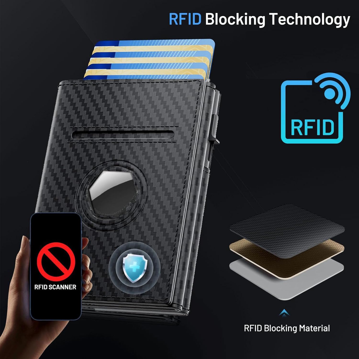 AirTag Wallet for Men, Mens Minimalist Wallet Compatible with Apple Air Tag, RFID Blocking Smart Pop Up Card Holder Wallet Holds 14 Cards with Cash Slot, ID Window, Gift for Men, Carbon Fiber Black