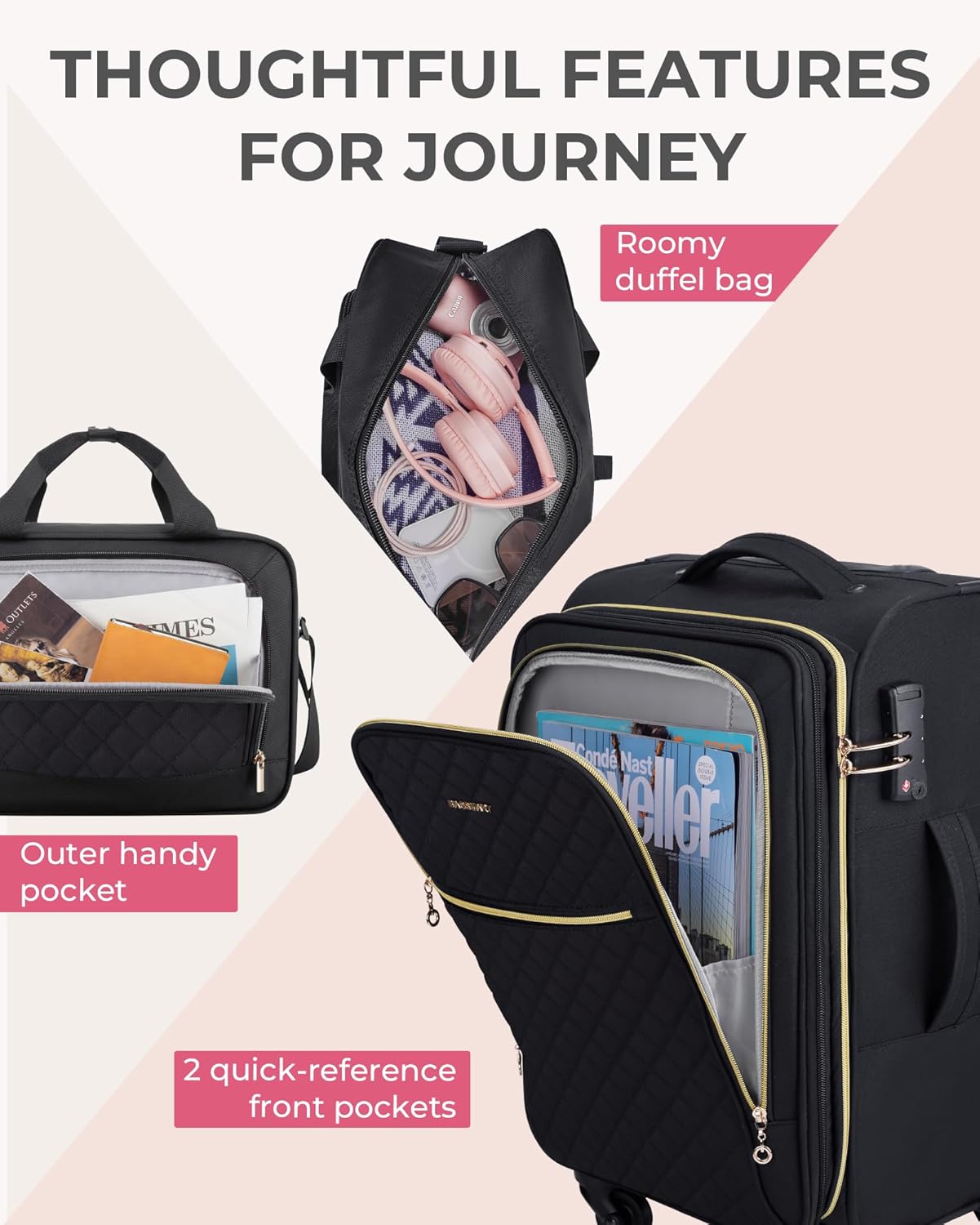 Pack In Extra- Softside expandable suitcase permits for added 2″ of width, providing 43L and further 8L growth capability for all sizes. With the exceptional handy expandability providing a immense packing capability to simply slot in 8 T-shirts, 5 pants, 2 coats, 1 pair of sneakers and different journey necessities. Ladies baggage is ideal for 4-7 days prepare and automobile journeys alike.