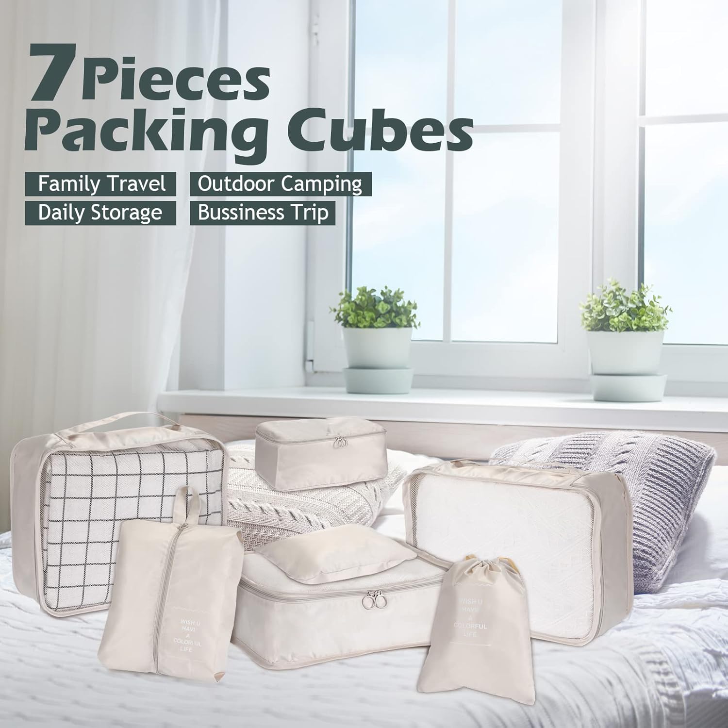 Massive Capability: the journey packing cubes have sufficient capability to carry your garments, which the big garments bag is good for 10-12 shirts, medium garments bag about 6-8 shirts, small garments bag about 4-6 shirts. The bra underwear bag is appropriate for bra underwear and socks, shoe bag can maintain 1 pair of slippers and 1 pair of sneakers and toiletry bag is on your toiletry equipment, private cosmetics and digital equipment, the laundry bag is on your soiled garments left