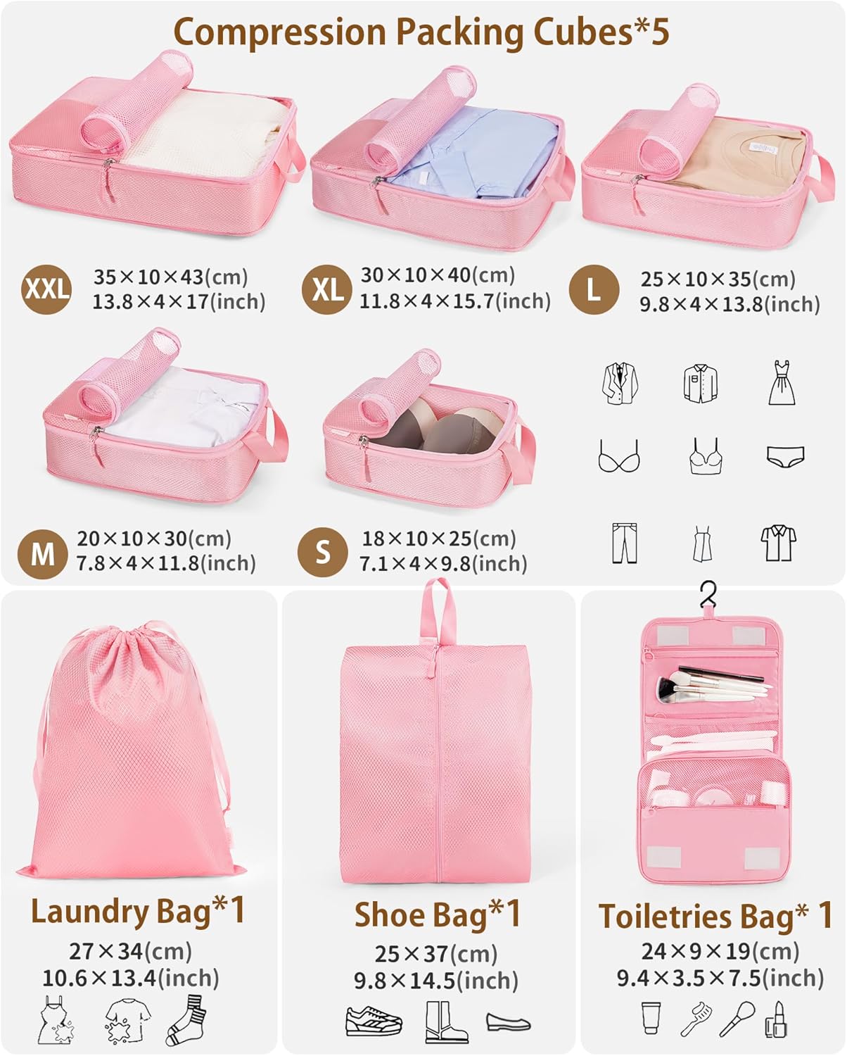 【Compression Packing Organizers 8 Set】There are 8 completely different objects, together with compression packing cubes * 5, laundry bag * 1,Shoe bag * 1, Toiletries bag*1.