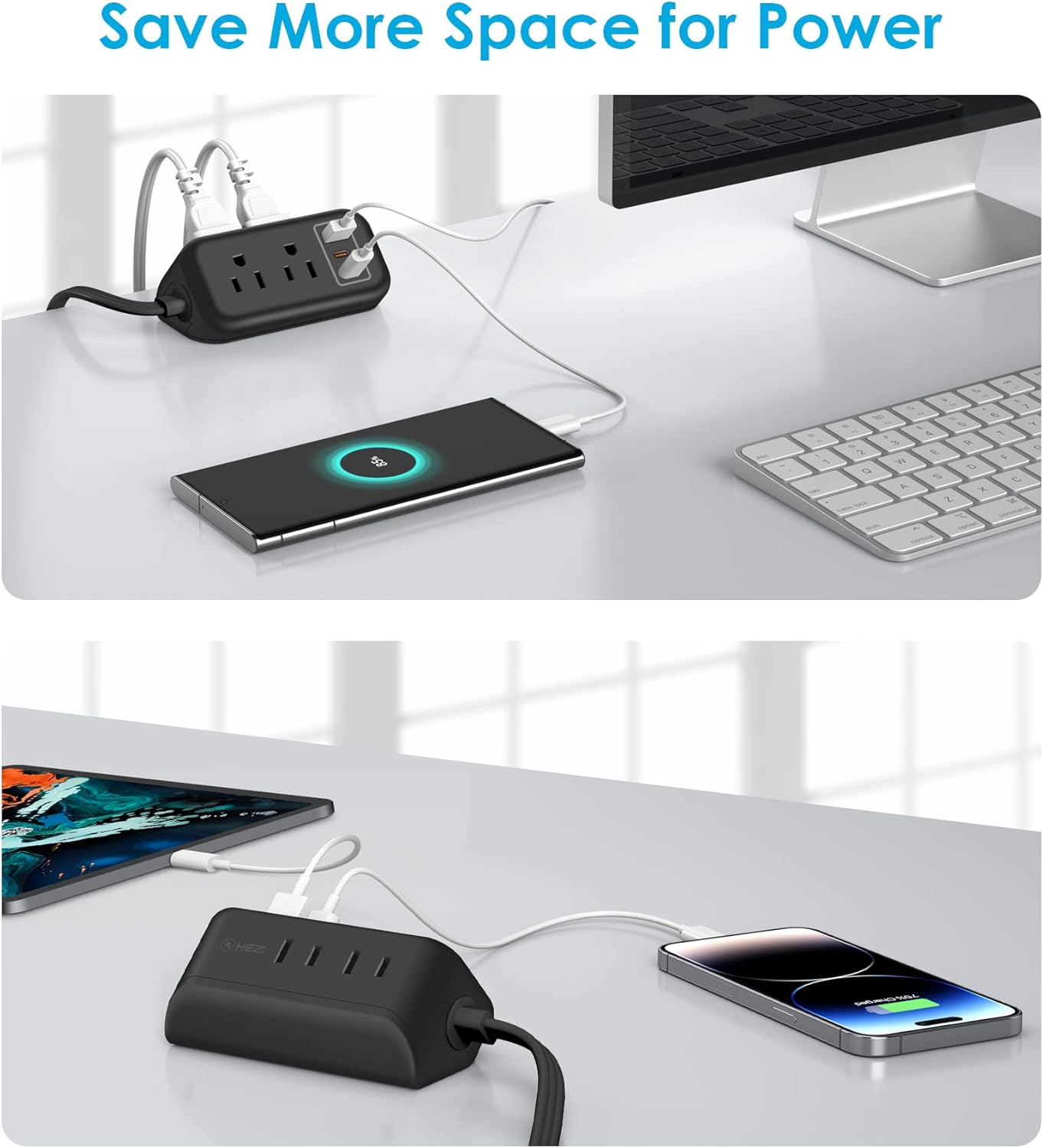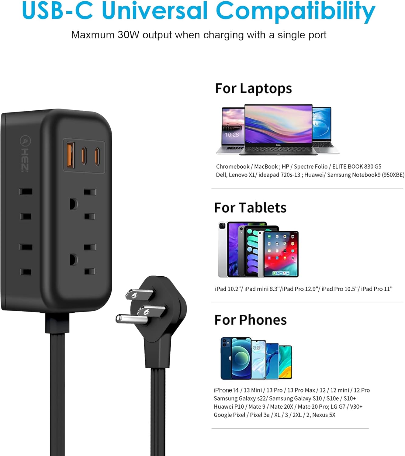 Energy your own home or workplace with 4 shops and three usb(2 us-c) charging ports by HEZI flat plug energy strip.