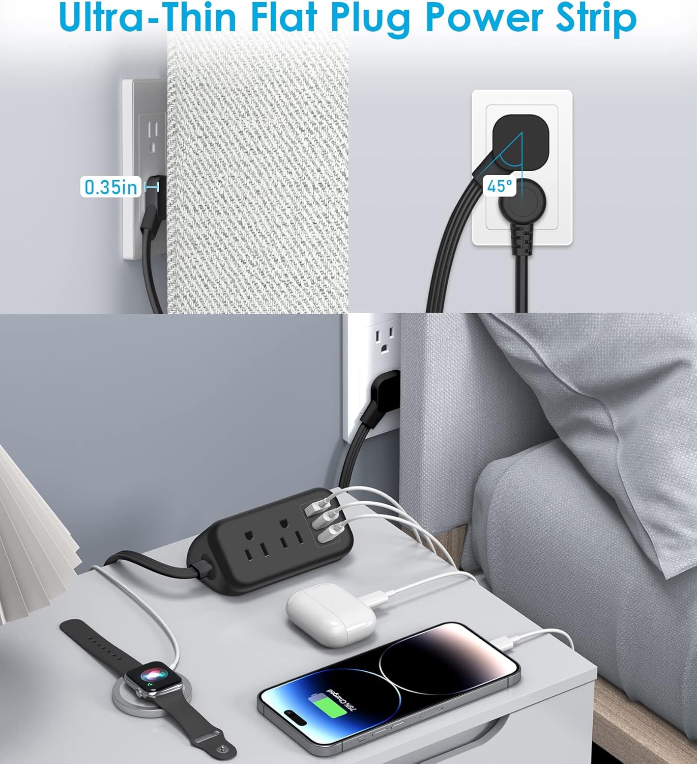 –With solely 0.3 in extremely skinny flat head design,can slot in tight areas extra simply, hiding behind furnishings, nightstand or fridges.