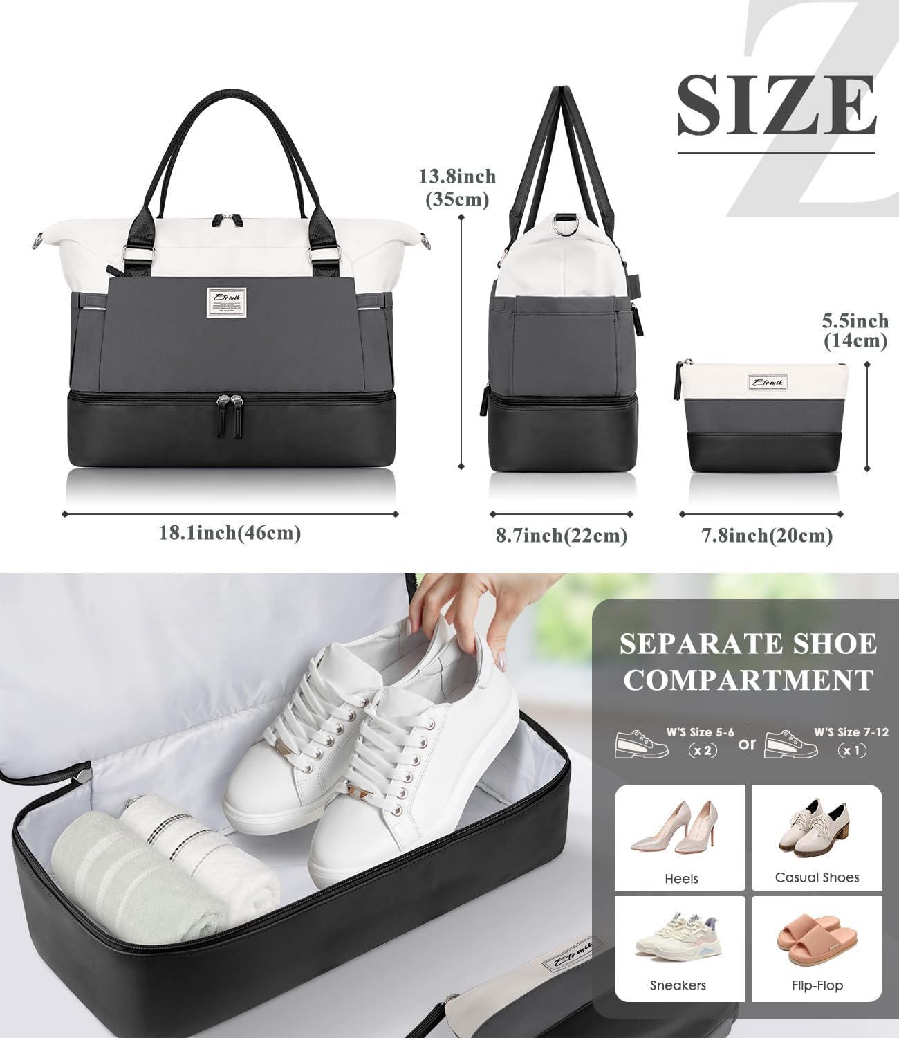 ETRONIK Weekender Bags for Women, Personal Item Travel Bag with Shoe Compartment, Carry On Overnight Bag with Toiletry Bag, Gym Duffel Bag with Wet Pocket for Travel, Sports, Hospital Black&Grey