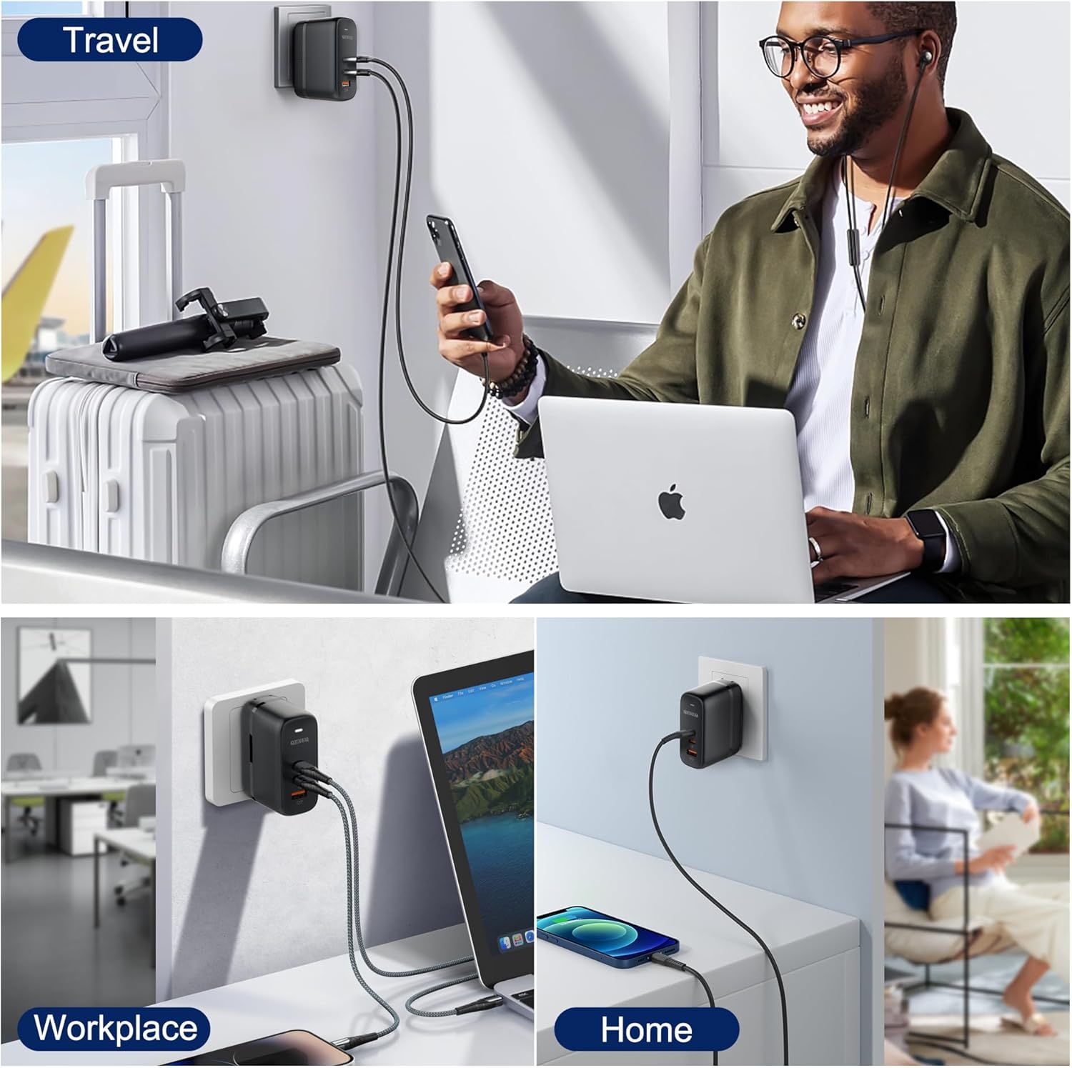 3-IN-1 Quick Charging: With 2 USB-C ports (Max 65W) and 1 USB-A port (Max 30W), effortlessly cost your cellphone, pill, and pocket book abruptly from a single usb c charger block.