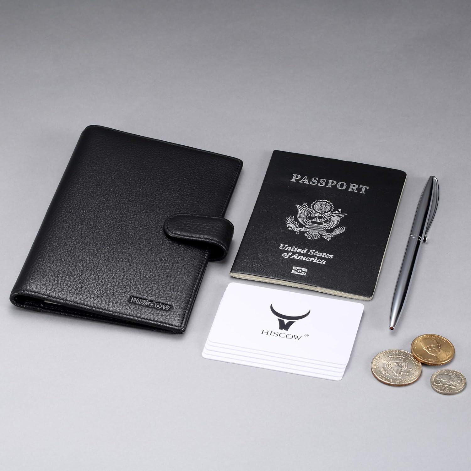 Inside particulars: 4 pockets for bank cards, 1 view pocket, 1 passport slot, 1 slot for small pen, 1 inside zippered pocket, 2 extra pockets for receipts