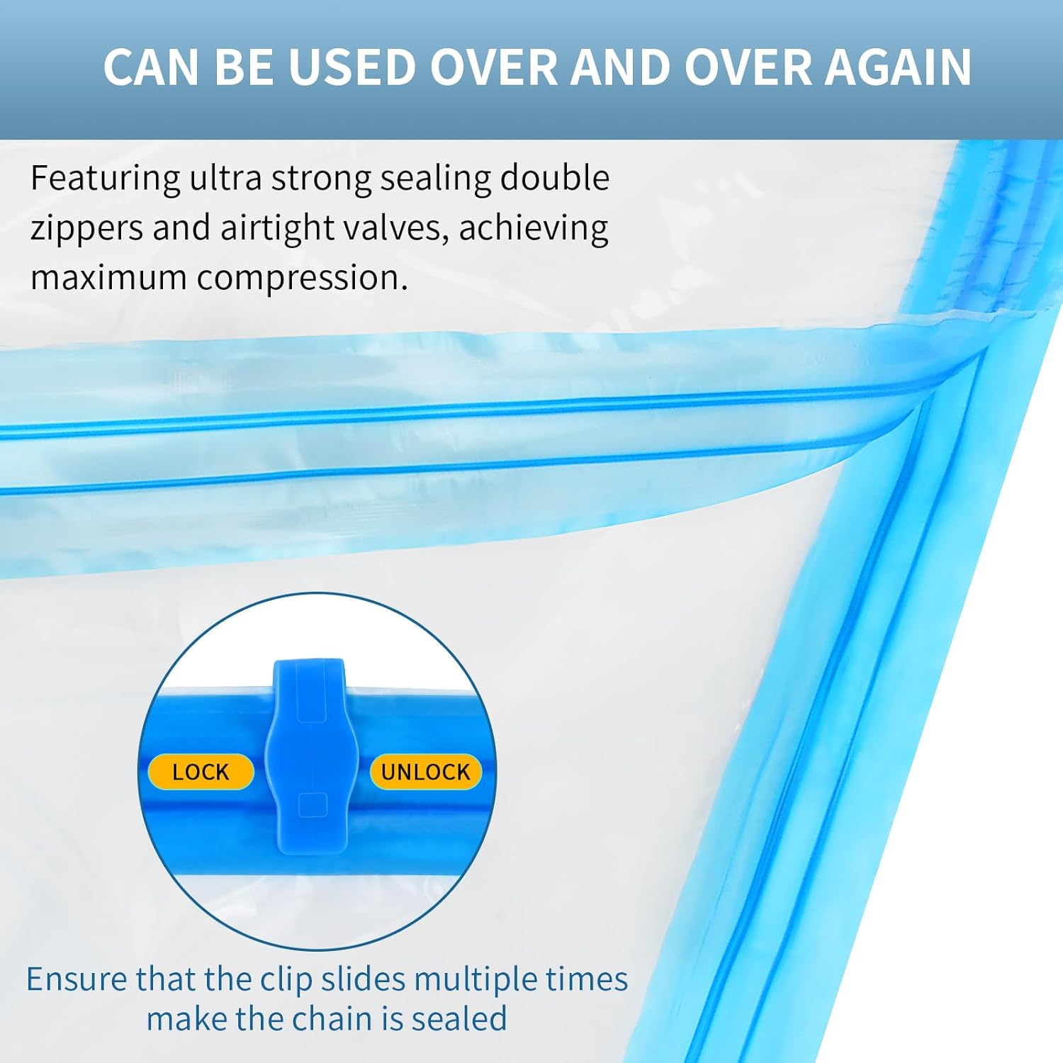 Stronger sealing—Every vacuum seal luggage for blankets has a double-zipper safety design with clip, and a sealed turbo valve with lid to successfully lowering the potential of air leakage