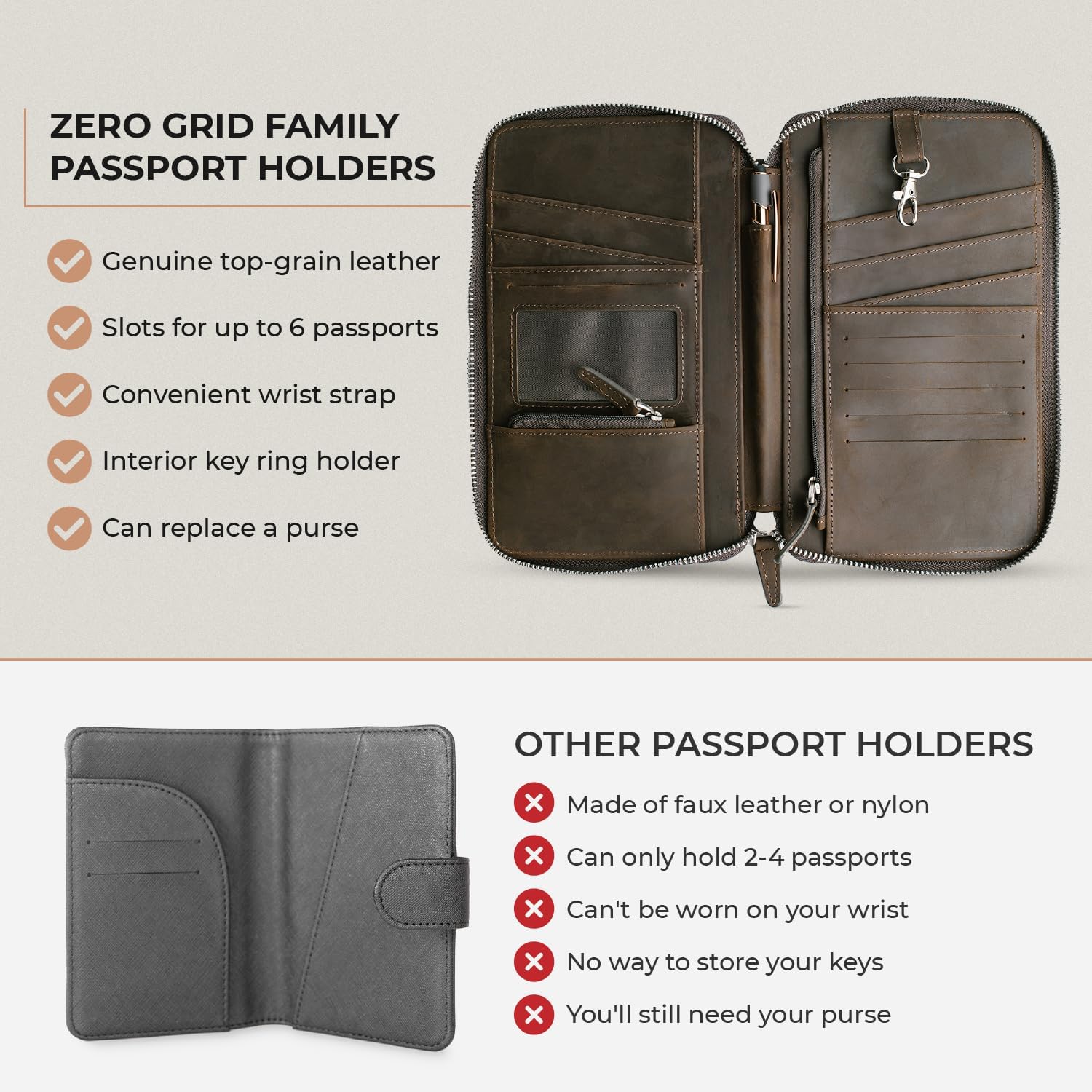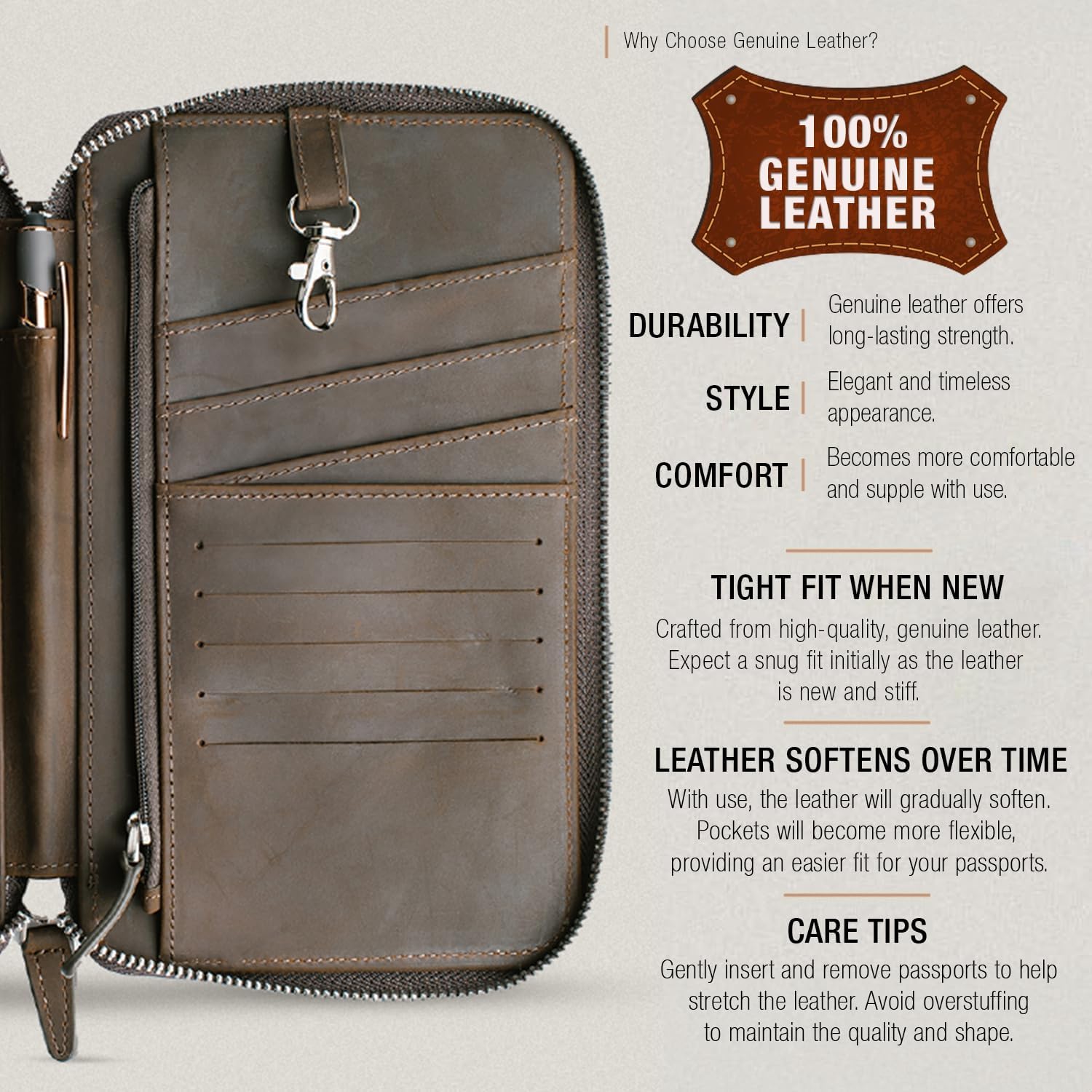 Made from Real Prime Grain Leather-based: Our household passport wallets are available Black or Brown, each are constructed from actual top-grain leather-based that’ll develop a lovely patina over time; They’re additionally outfitted with heavy-duty Ykk zippers that guarantee nothing slips out