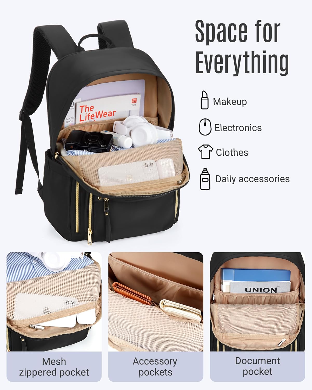 Spacious & Organized Storage: This ladies’s laptop computer backpack includes a devoted compartment for laptops as much as 15.6 inches, complemented by 5 inner pockets and 4 exterior pockets for optimum group. The roomy important compartment simply accommodates each day necessities like clothes, books, and tech equipment, making certain you’ve got the whole lot you want at your fingertips