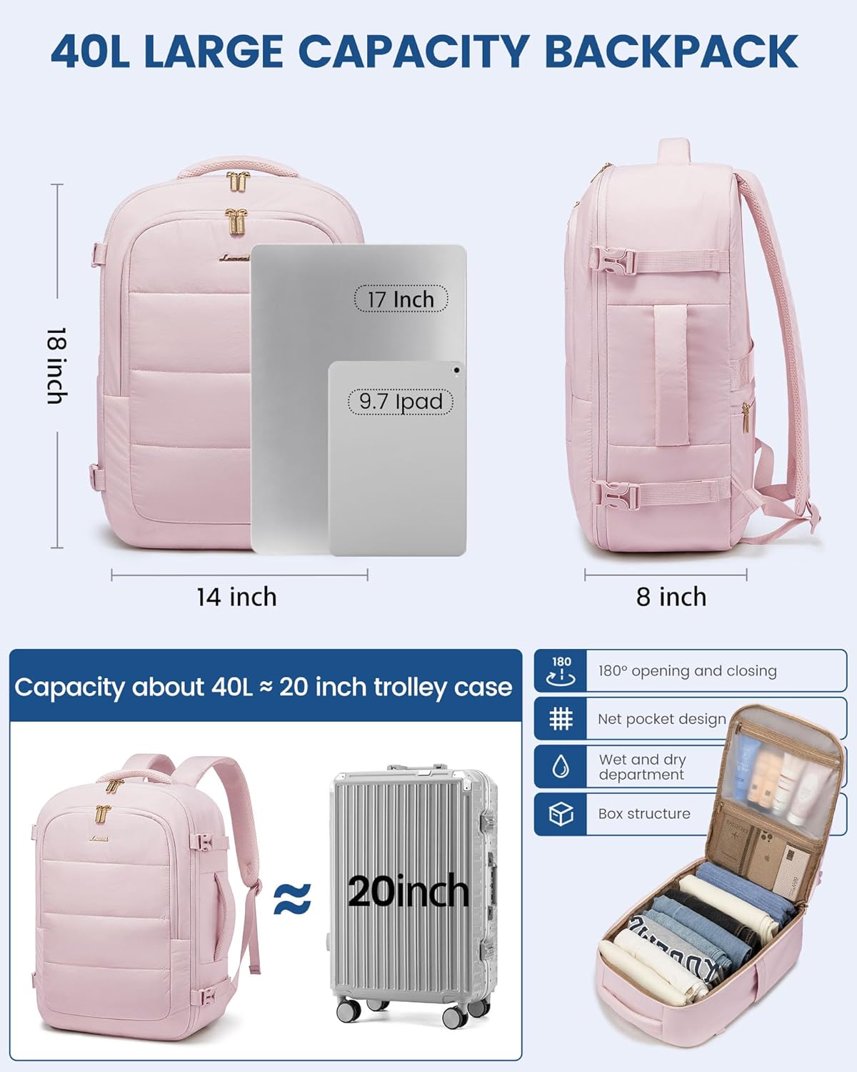 【Airline Authorized &TSA Pleasant Design】Measures 18x14x8 inches, assembly most airways’ necessities. It matches below seats or in overhead compartments and opens 0 to 180 levels for fast safety checks, making it a great private merchandise for air journey.