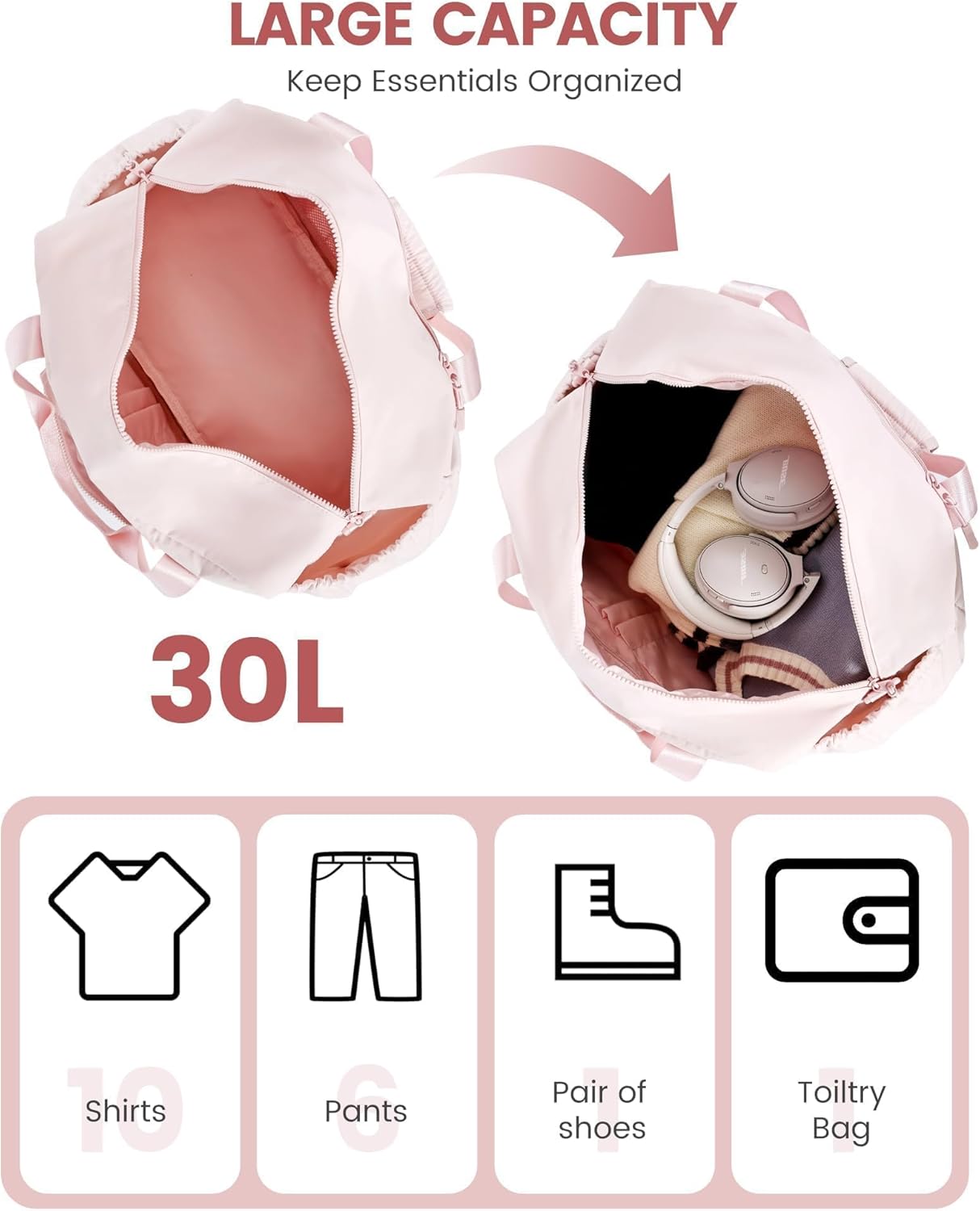Maintain Your Necessities Organized: Our 30L bag organizer is ideal for weekend getaways! With ample area and a number of compartments, it retains every part neatly in place. Plus, it features a fashionable toiletry bag on your cosmetics. Journey good and in type!