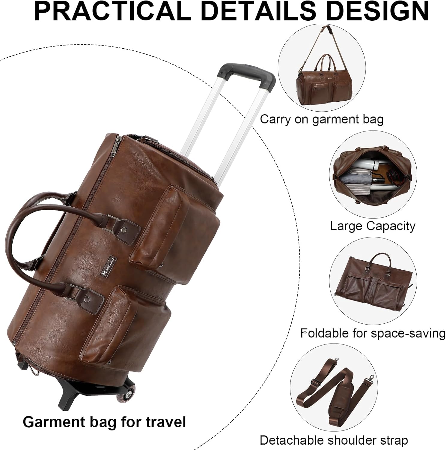 Modoker Rolling Garment Bag for Travel Wheeled Duffel Bag Luggage Suit Travel Bags for Men and Women,3 in 1 Carry on Convertible Garment Bag with Wheels,Dark Brown