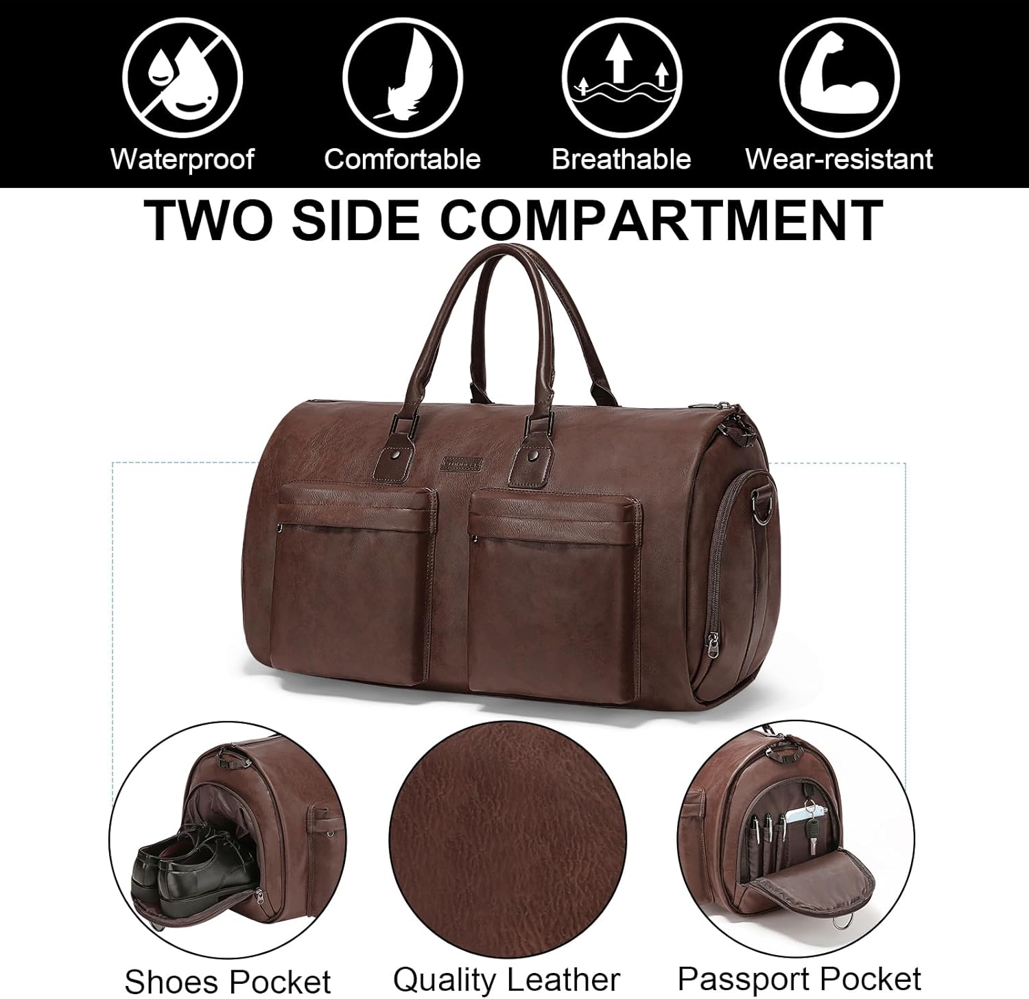 45L DUFFEL BAG with SHOES COMPARTMENT: After assembled, this garment bag works excellent as a 45L duffel bag/curler baggage. On the left aspect pocket of this leather-based garment bag is a sneakers pouch. And the proper aspect pocket is designed for passport, keys and another small objects. Vegan leather-based garment bag has additionally received two entrance pockets for small objects for fast entry