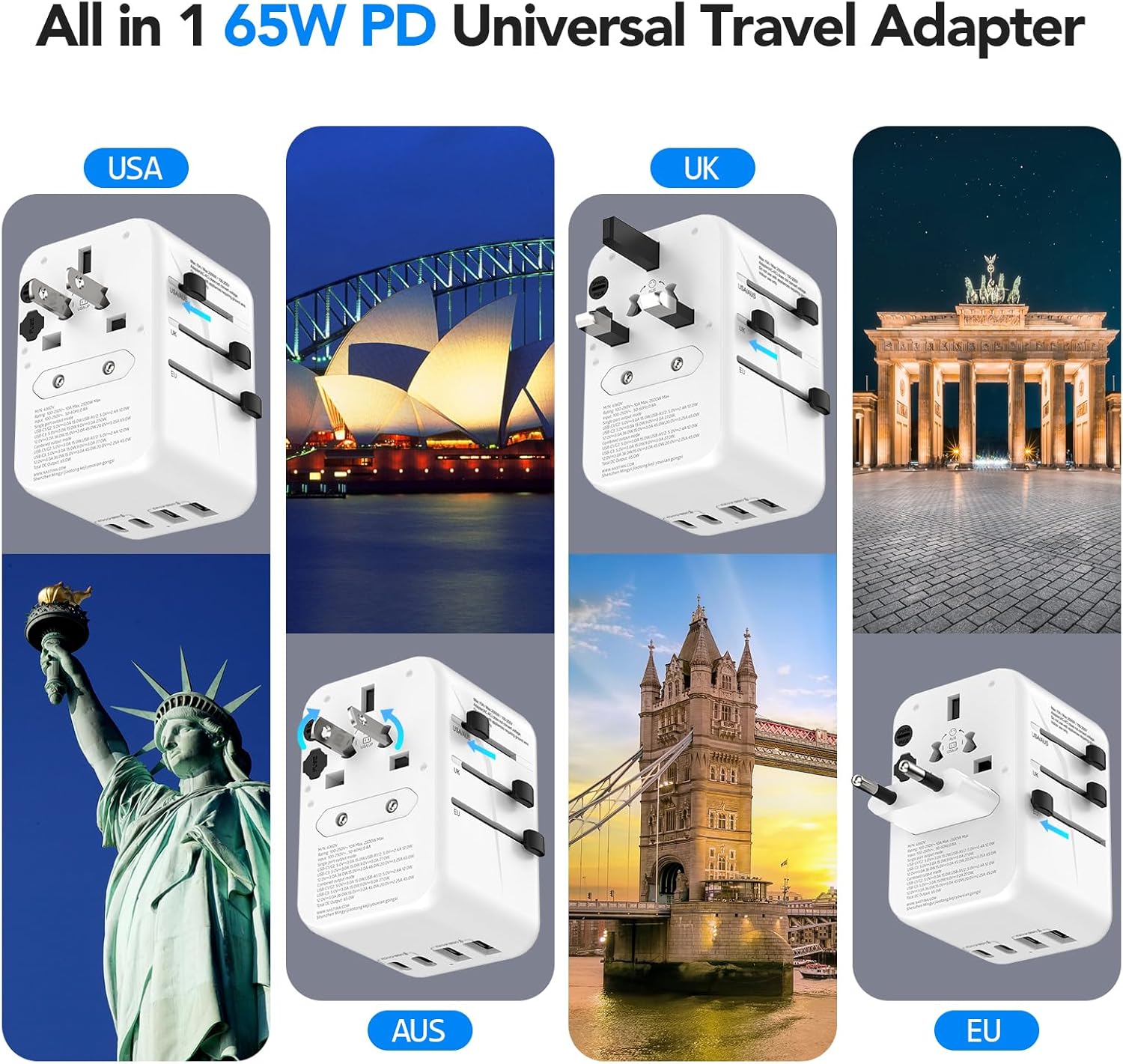 ✅【PD 65W Quick Charging】: The worldwide adapter has a complete of 5 ports: 1*65w Kind C port, 2*15W USB-C ports and a couple of*12W USB-A ports, supporting PD3.0 and QC3.0 quick charging. 1 AC outlet assist energy 5 gadgets concurrently with excessive velocity, max energy 1000W at 100Vac 2500W at 250Vac.
