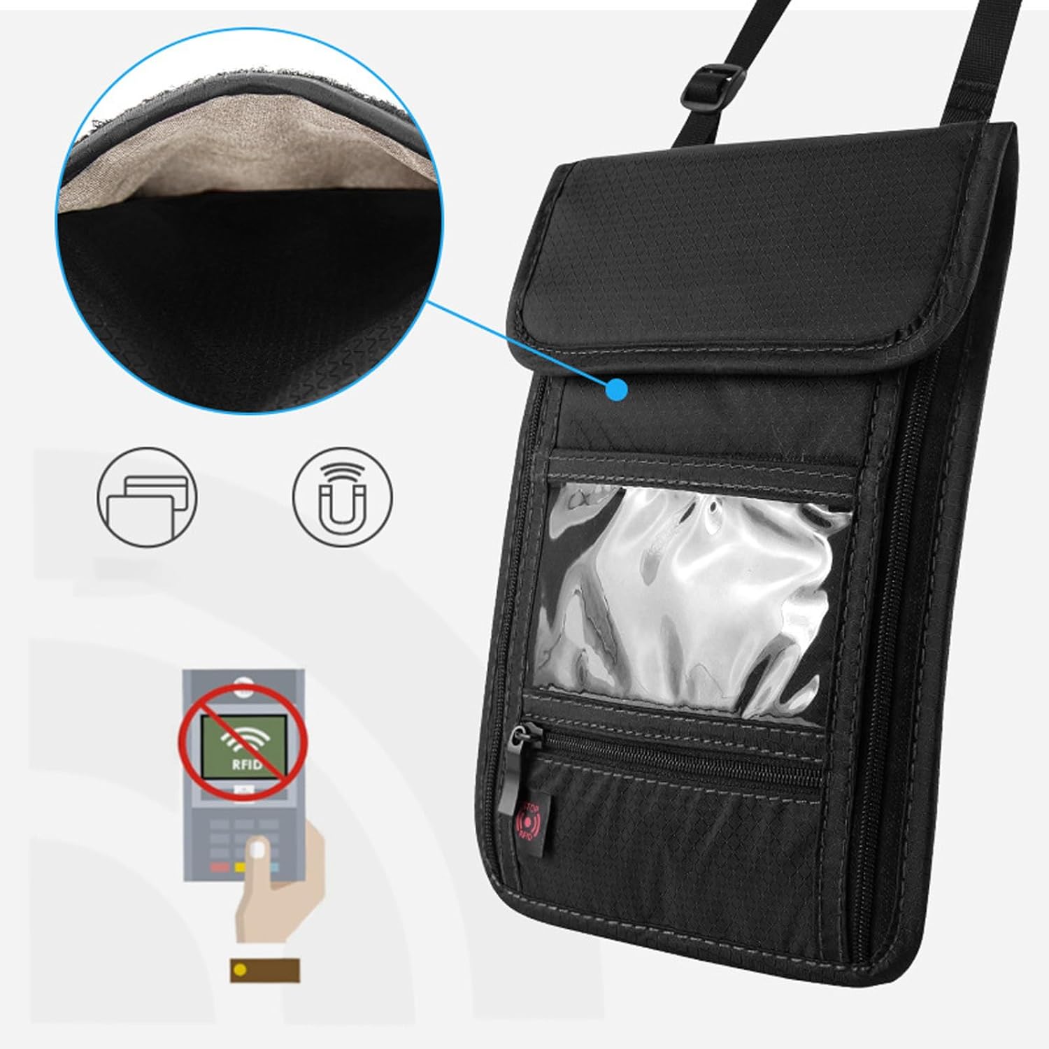 Our Passports holder comes with adjustable hook, strap and loop fastener, can simply put on across the neck, waist or beneath clothes.
