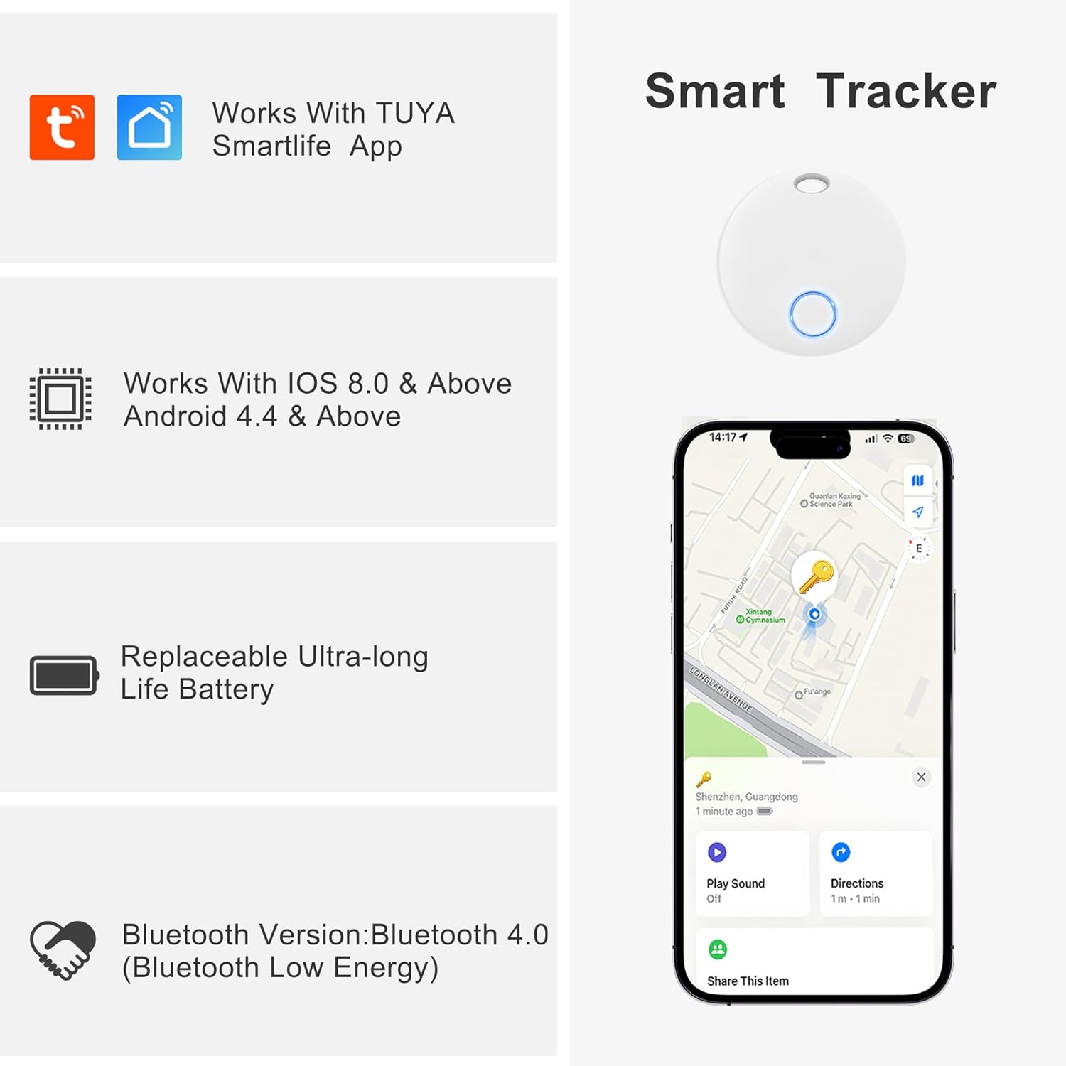 【10-50 meters】The Bluetooth Transmission Distance of the Anti-loss Machine is Typically Between 10-50 Meters, Past Which the Anti-loss Machine Will Lose Connection. (Metallic, Concrete and Different Obstacles Will Take in and Mirror the Bluetooth Sign, Leading to a Shorter Transmission Distance)