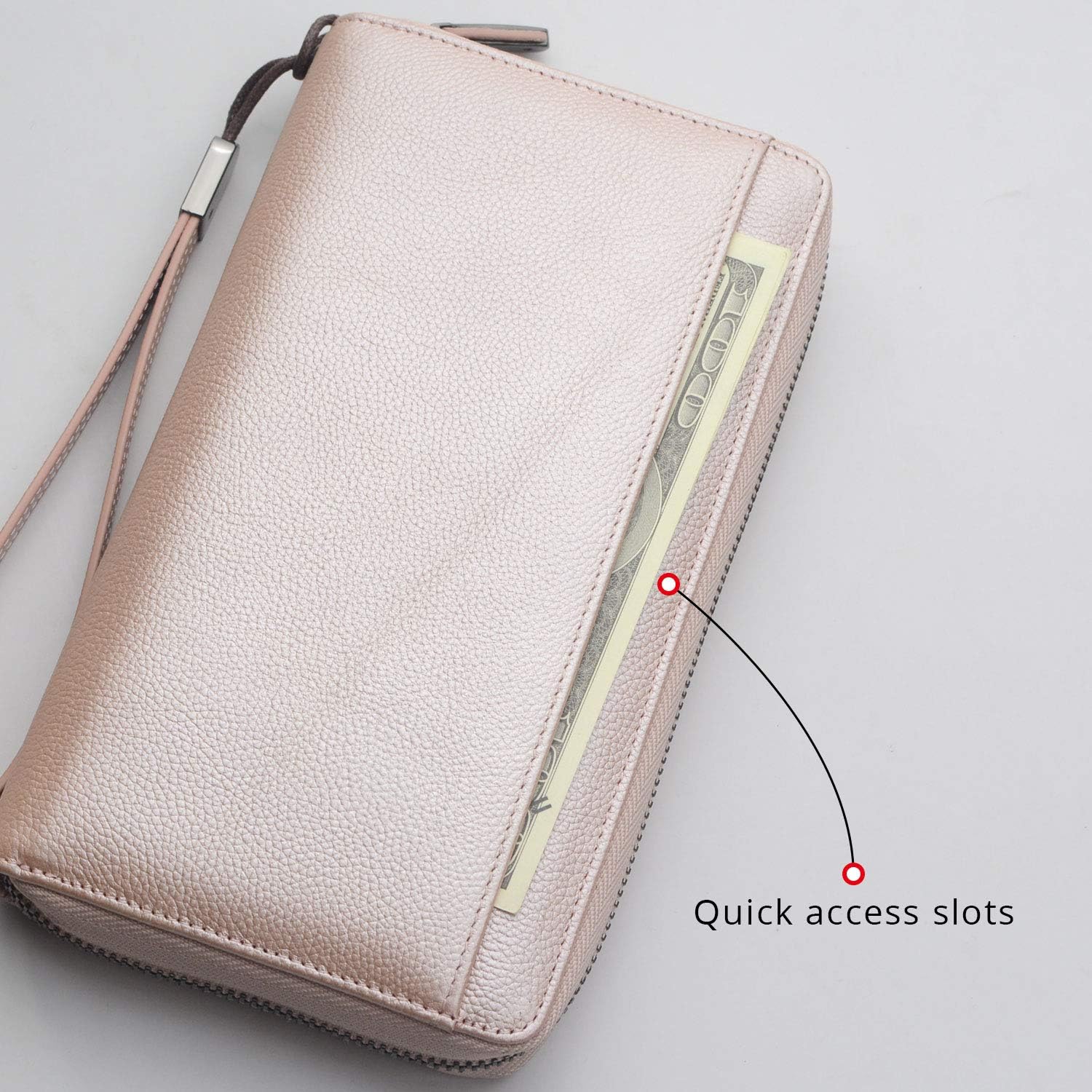 Travel Document Organizer RFID Blocking Leather Multiple Passport Wallet Family Holder Id Wrist Strap(Rose Gold)