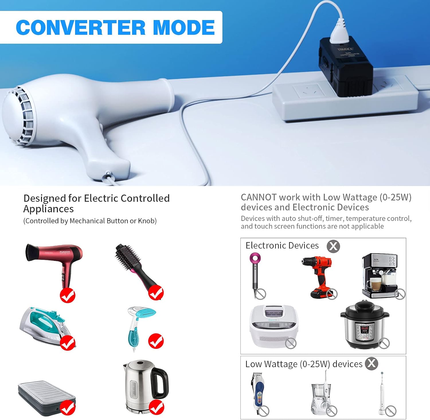 Converter Mode: Convert voltage from 220-240V to 110-120V for single voltage (110V, 120V, 125V or 100-120V) Mechanical managed gadget, likes Hair Dryer, steam Irons, electrical kettles.