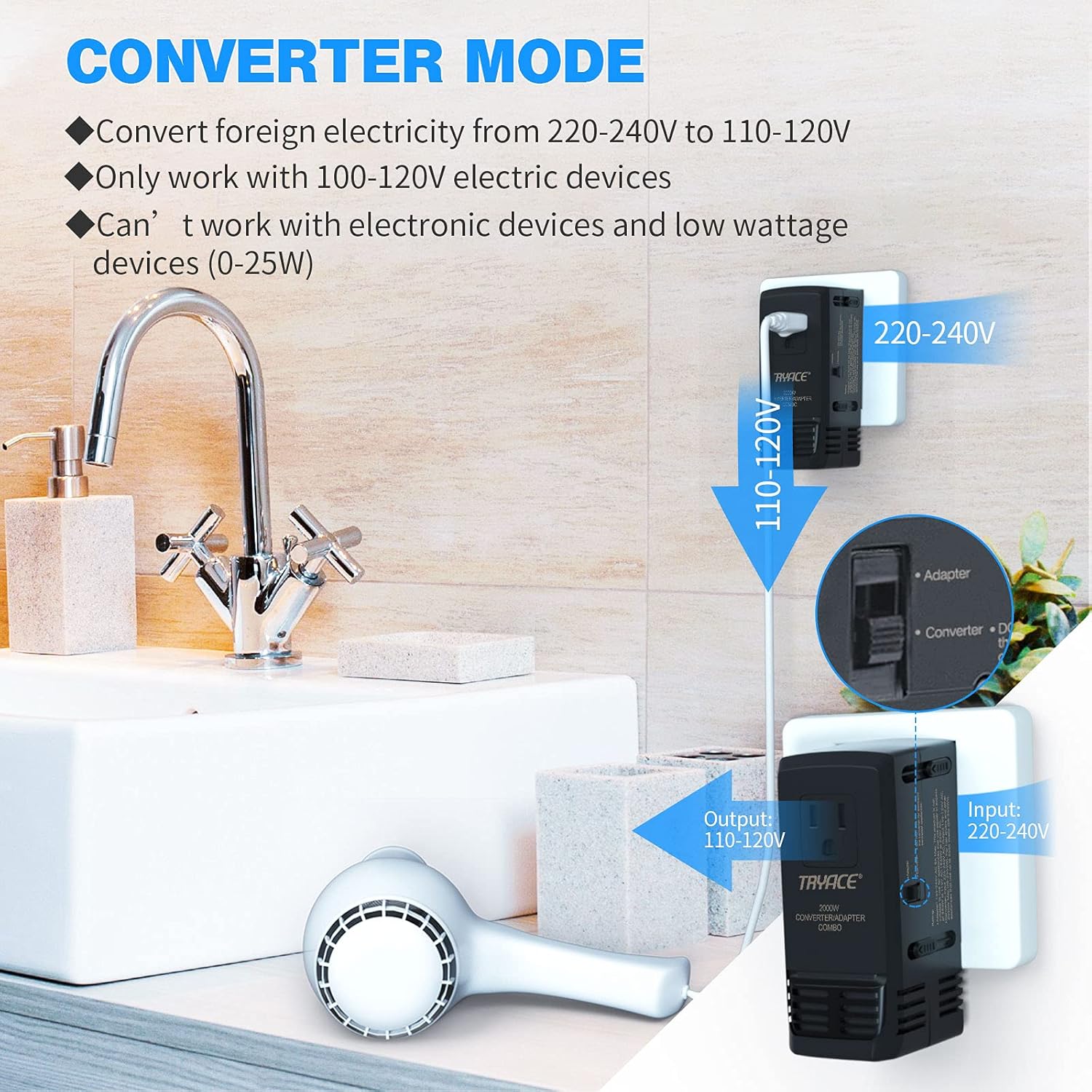 Converter Mode: Convert voltage from 220-240V to 110-120V for single voltage (110V, 120V, 125V or 100-120V) Mechanical managed gadget, likes Hair Dryer, steam Irons, electrical kettles.