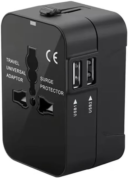 Universal Travel Adapter with Surge Protection, 2 USB Ports, International Power Converter, Black