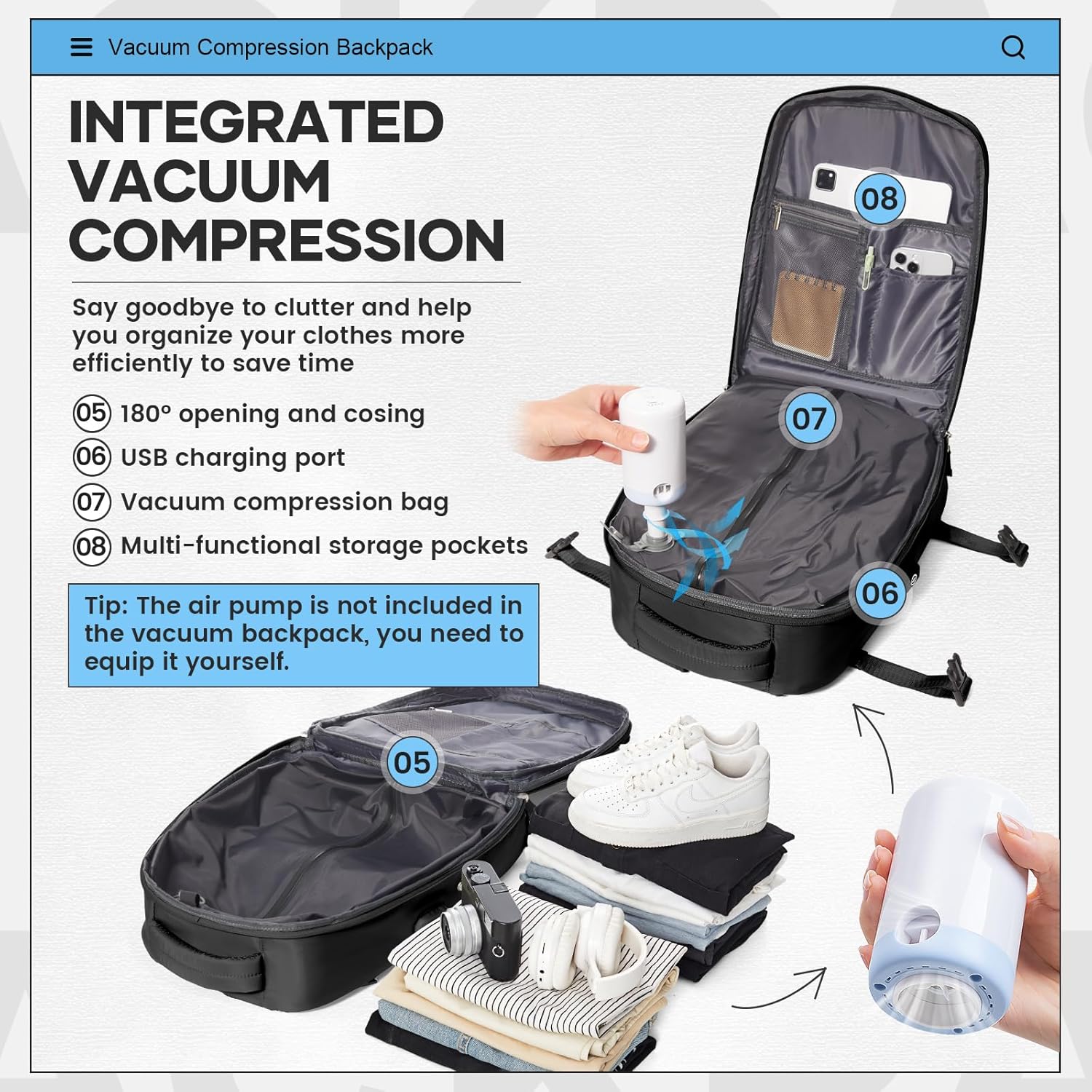 【Simple to Use Vacuum System】The vacuum system is easy to function. Merely open the valve and use an electrical vacuum pump to rapidly pull out the air, or press the air manually, and shut it tightly; Vacuum Backpack successfully compresses your belongings, saving as much as more room;You possibly can simply pack extra garments or different necessities in your journeys or every day use.( with a vacuum pump).
