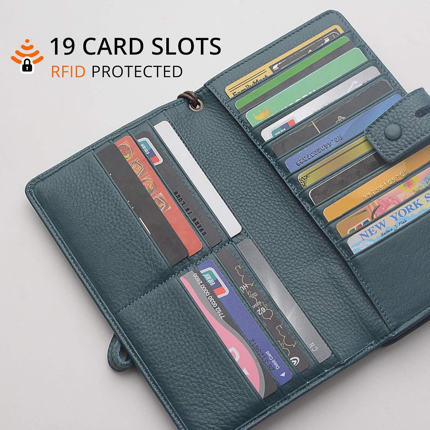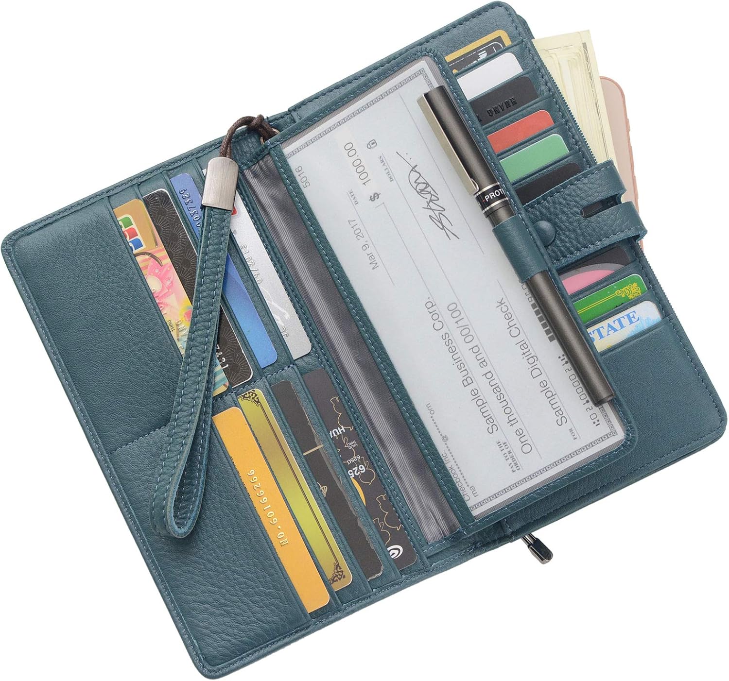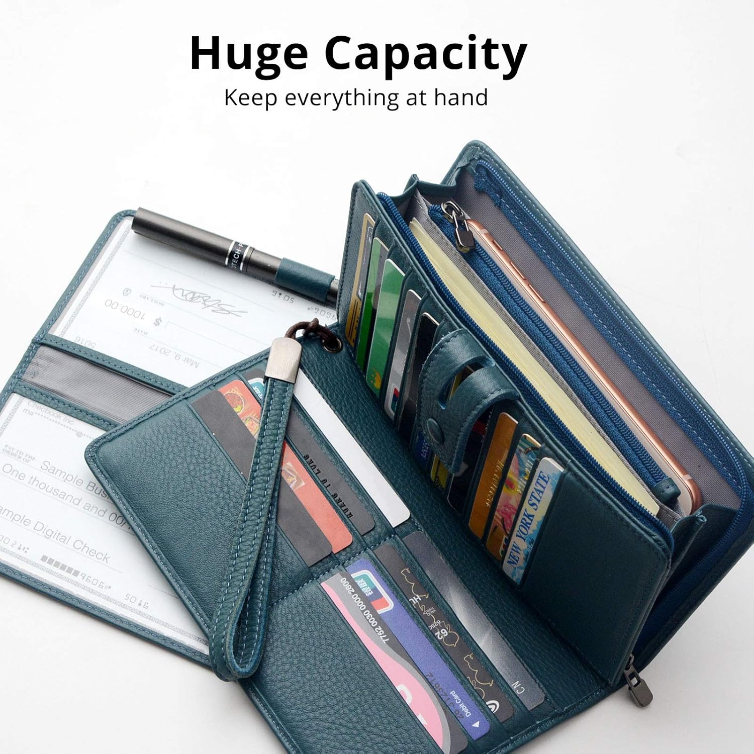 LARGE CAPACITY OVERSIZE WALLET: 19 bank cards, 1 ID window,1 passport pocket (can match 2-3 passports),a detachable checkbook cowl with 1 pen holder(can used as a checkbook pockets),An exterior zippered pocket reveals 2 further pockets for storage money, cellphone(can match iPhone X XR XS Max 7/8 plus)and a zippered coin pouch. Dimensions: 7.79″L x 4.33″W x 1.37″H