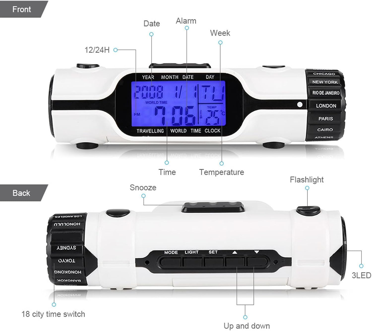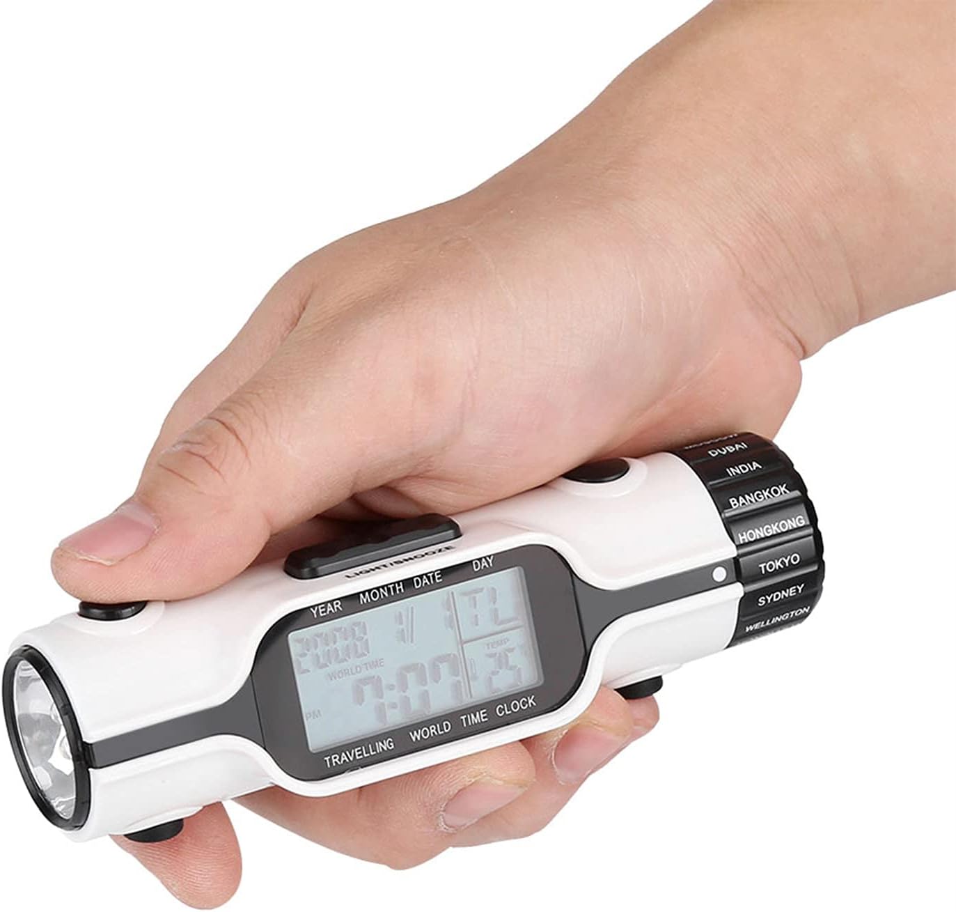 ⏲️World Time Journey Clock—Journey Alarm Clock. The alarm clock is light-weight and pocket sized flashlight with world time clock with 18 time zones. Flashlight accommodates 3 brilliant LED’s, might help you gentle up at the hours of darkness night time. This journey alarm clock is good for touring. Very light-weight to place in your pocket.